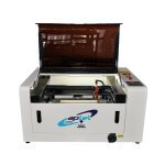 أبعاد الماكينة 93 سم ×78 سم × 55 سم. مساحة العمل 30 سم × 40 سم. قوة ليزر40 واط سماكة .6mm دقة الطباعة 4500 dpi تقنية Laser CO2